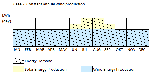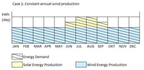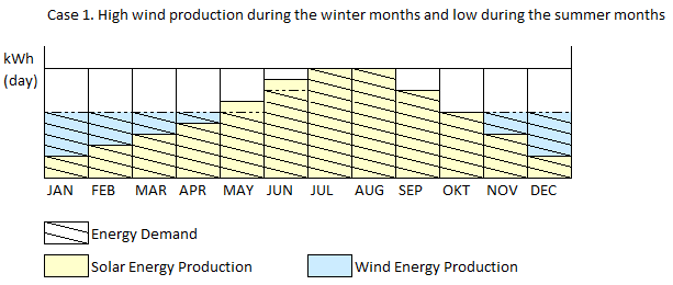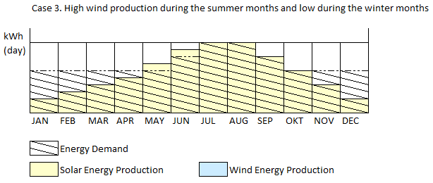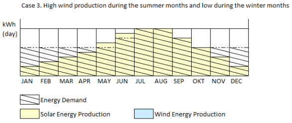 This case is what we would call the ideal case for installing a hybrid type installation. The lower contribution of solar production during the summer months will be offset by wind energy production during the rest of the year.