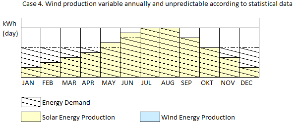 Next, for your better understanding, we will analyze several typical cases. Solar energy production will be higher during the summer months, in all cases. The production of wind energy will be of a different type for each case: